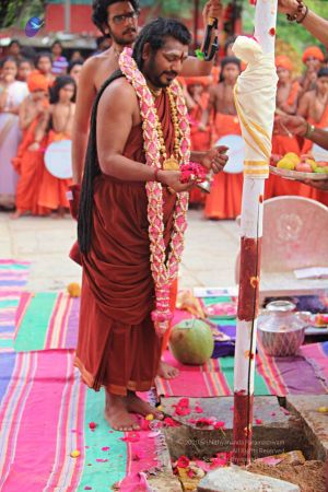 | + | File:20171001_Photo_102_10XKoHNpLS3zpK1RLgrty_uBOsZdN3MuA.jpg | Balasant performing puja for panda kaal ritual at the Nithyanandeshwara Sadashiva Temple for the Nithyanandeshwara Brahmotsavam at Adi Kailaasa, Bengaluru Aadheenam | ||