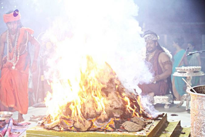 | + | File:20170831_Photo_169_15XK-G1zUAeSmmnZu3WYe0koyQOkY6AgN.jpg | His Divine Holiness ignites the Spiritual Alchemy Process - cowdung from Nithyananda Goshala's pure Desi cows is burnt to generate the smoke necesary for preparing authentic Aushadha | ||