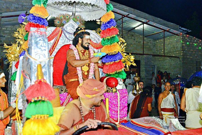 On this day, the Supreme Pontiff of Hinduism (SPH) Bhagavan Nithyananda Paramashivam elaborated on the Spiritual Alchemy Product called Sadashiva Mandala. SPH shared that this was the best spiritual alchemy product Sadashiva revealed, and SPH made it into reality. It has forty six garbhas and carries he energy which is independently intelligent to keep our neurology in the space of Sadashivoham. Forty three are on the top, three are inside. Below there is a Sri Chakra in 2D dimension. Above the same Sri Chakra in 3D dimension, that represents the whole Cosmos. The whole Cosmos, actually if we go millions of light years away and capture the Cosmos, it’ll look exactly like that. That is the way the exactly Cosmos is structured, that forty three triangles - the Meru. That’s the way exactly Cosmos is structured. And that represents the whole Cosmic energy. Inside the three energies, that represents Sadashiva, Devi and SPH, all the three energies. Paramashiva’s form is given with thousands of heads and thousands of hands, Devi sitting on the lap and Paramashiva is gracing. This is the best ultimate mandala and can be worshipped as a deity also. Later that day the Sadashivoham Delegates participated in the Holi Procession that took place in Adi Kailasa, Bidadi Adheenam.