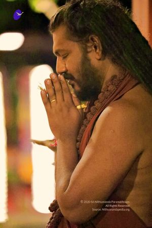 HDH Nithyananda Paramashivam praying and bowing with reverence to all Deities of the Svayambhu Nithyanandeshwara Temple at Adi Kailaasa, Bengaluru Aadheenam