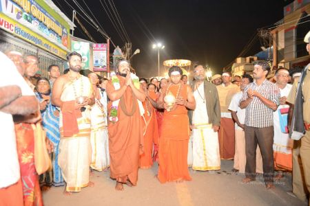 His Holiness blesses devotees on the streets of Tiruvannamalai in Panchamurthi Procession of the Annamalaiyar Temple in Thiruvannamalai