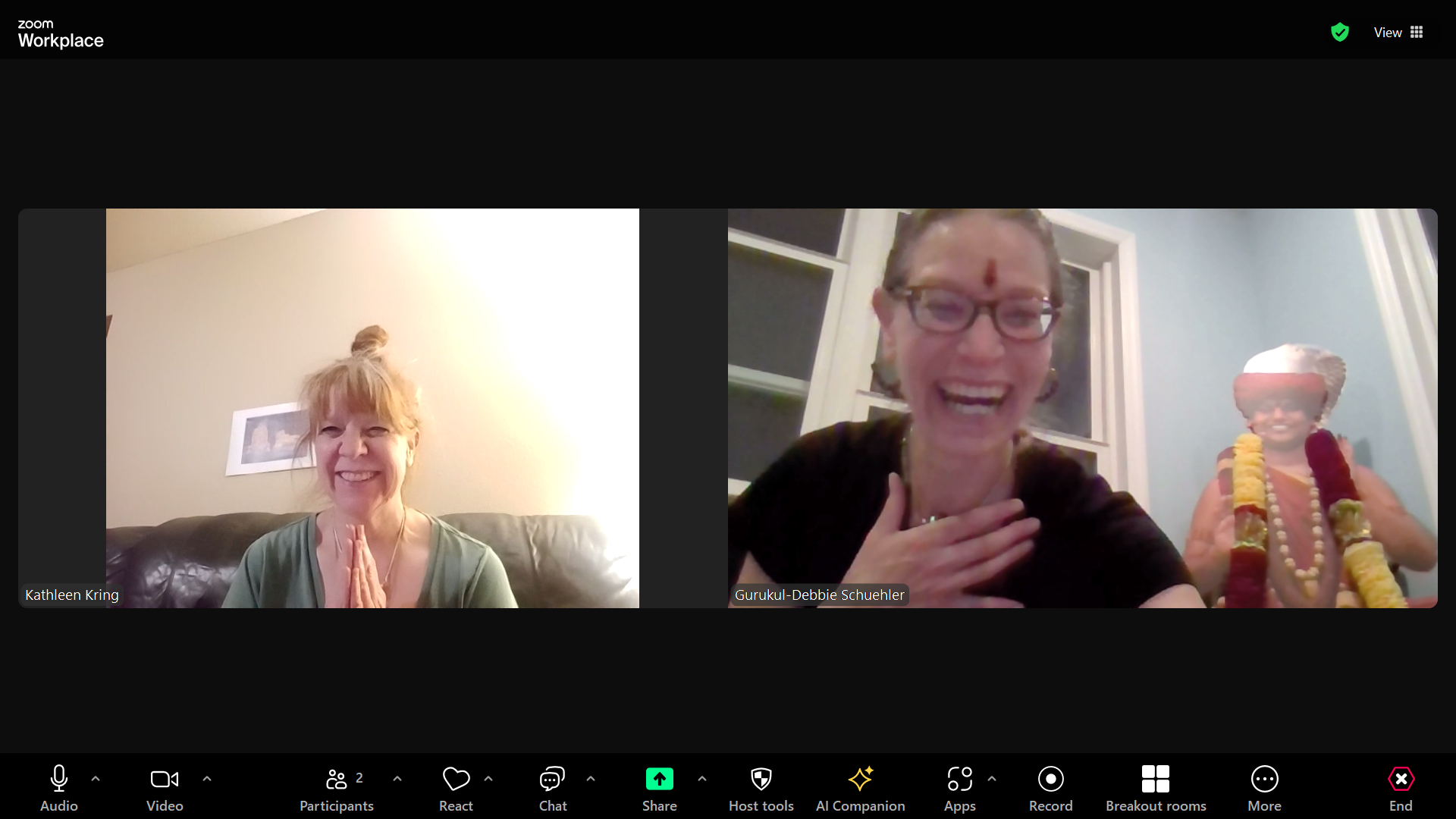 The session specifically involved performing 108 cycles of PVK Nithyananda Yoga alongside the powerful breathing practice of Trinetra Kumbhaka. These techniques are integral components of the spiritual curriculum gifted by THE SPH to revive the ultimate spiritual ecosystem on Earth. Ma Kathleen offered the specific *seva* (selfless service) of leading the yoga practice, while Ma Debbie offered the *seva* related to the Trinetra Kumbhaka.