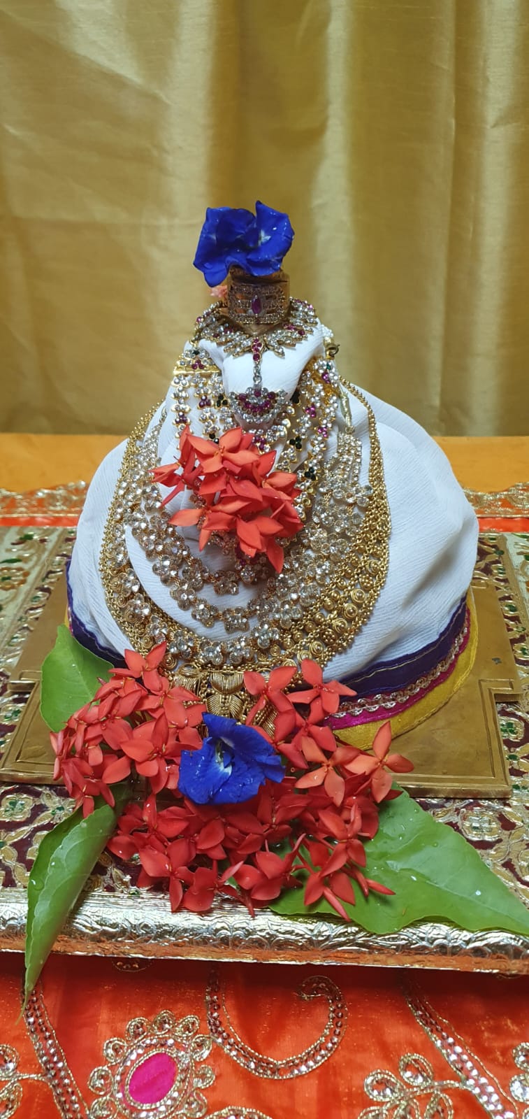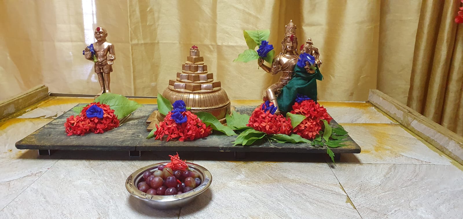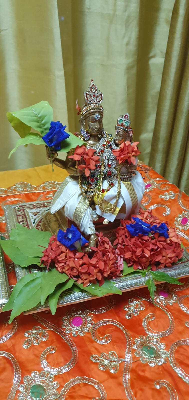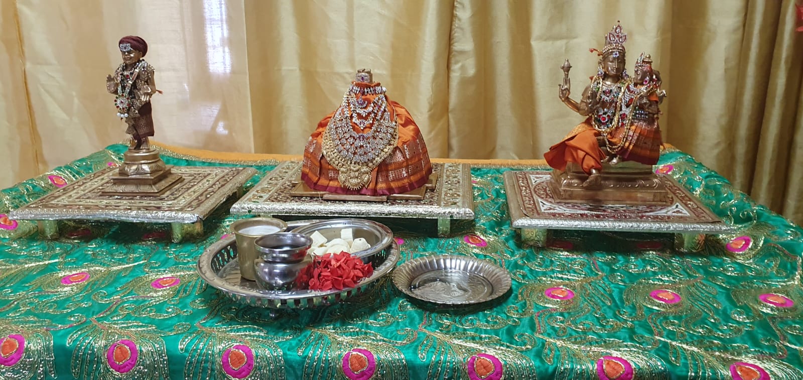 Following the ritual purification, the deities were transformed through the sacred ceremony of Deity Alankaram. The deities were meticulously dressed and adorned with intricate jewelry in this sacred ceremony, enhancing their divine appearance and radiating auspiciousness into the community. The ritual cycle continued with a second Laghu Puja which included another Naivedyam offering, formally concluding the Abhishekam sequence and preparation. The subsequent rituals included a third Laghu Puja where ten specific rice Naivedyams (cooked vegetable and rice offerings) were prepared and offered, ensuring a total of 15 Naivedyams were presented throughout the sacred morning schedule.