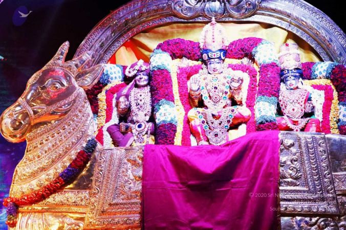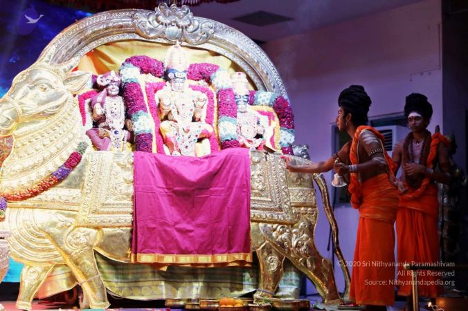 Nithyananda Purnima Brahmotsavam celebration special alankars (decoration) done for HDH Nithyananda Paramashivam, Sundareshwara, and Meenakshi Devi