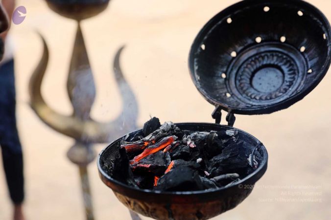 Brass burner lit with charcoal used for burning aromatic sambrani or dhoop (benzoin resin)
