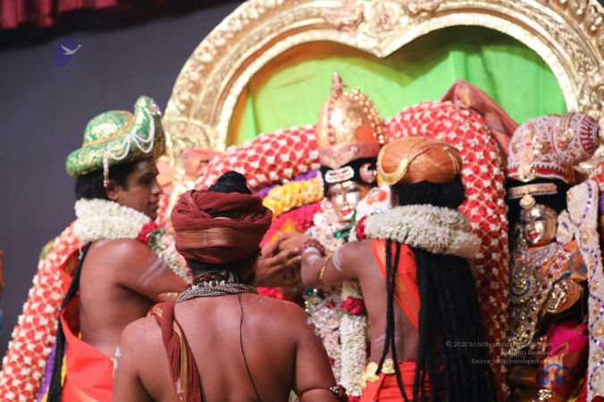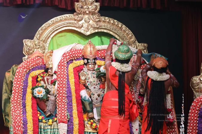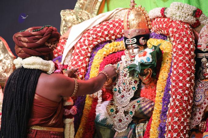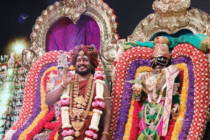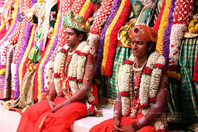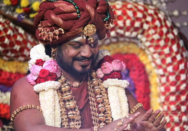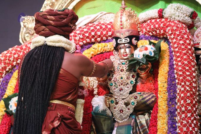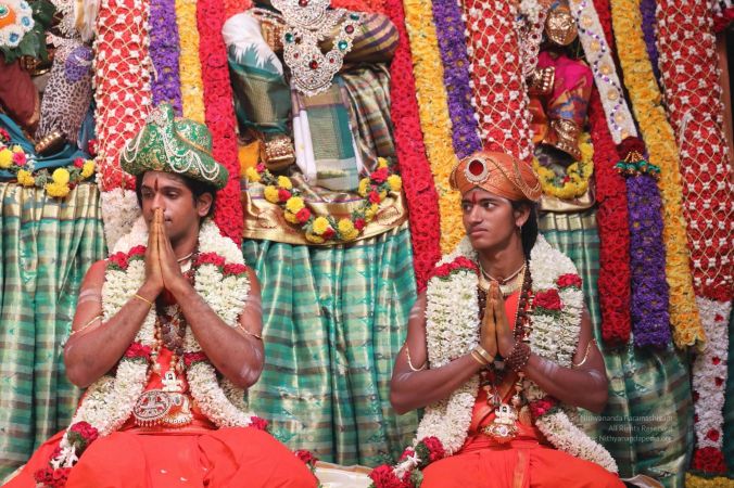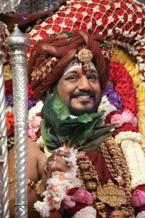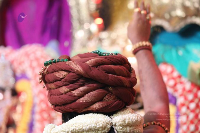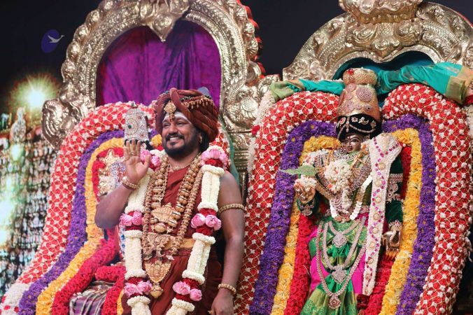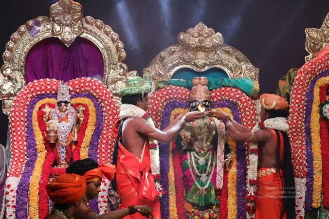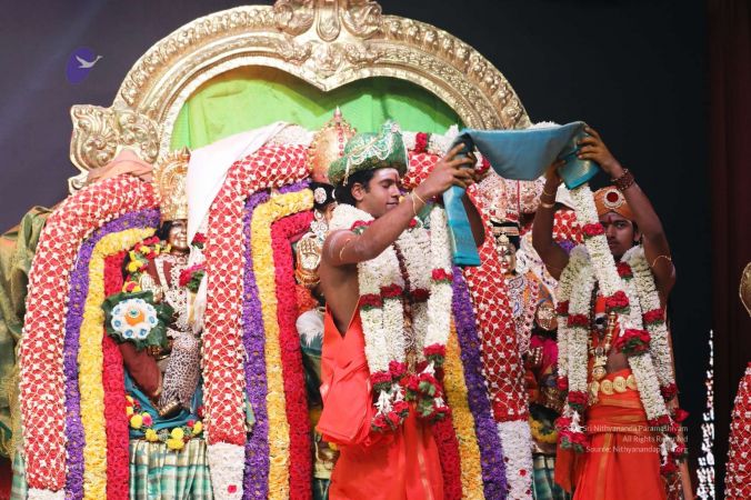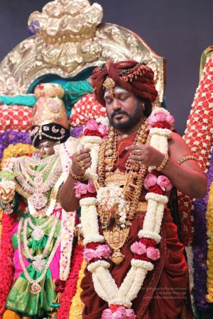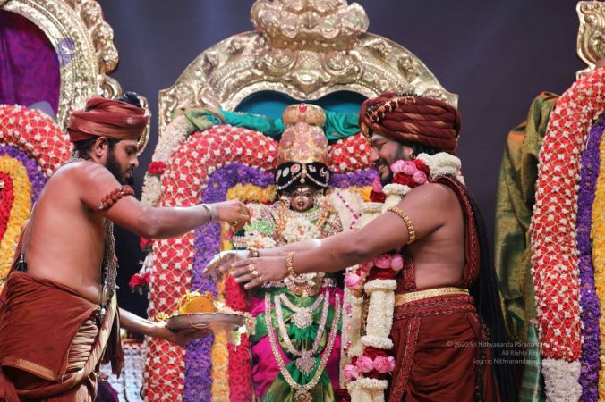 Meenakshi Thirukalyanam - The celestial marriage of Nithyanandeshwara Paramashiva and Nithyanandeshwari Parashakti, in their incarnations as Lord Sundareshwara and Goddess Meenakshi re-enacted by temple priests. This occassion was celebrated in a grand way at Nithyananda Peetham, Bengaluru Aadheenam, in the traditional Pandya style.
