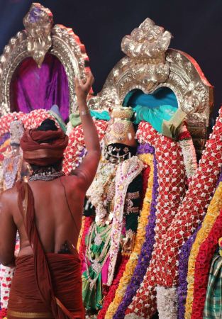 Meenakshi Thirukalyanam - The Celestial Marriage is re-enacted by temple priests.