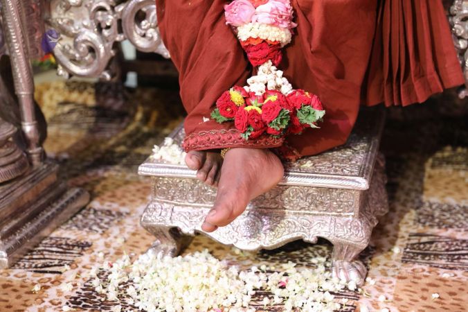 Blessed couple offering their gratitude at the Masters' Feet
