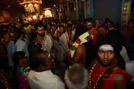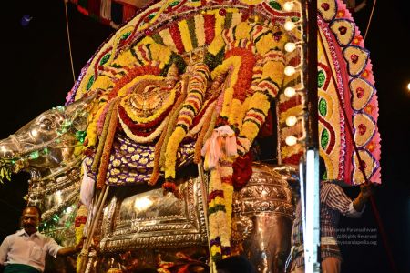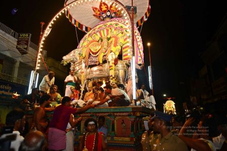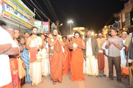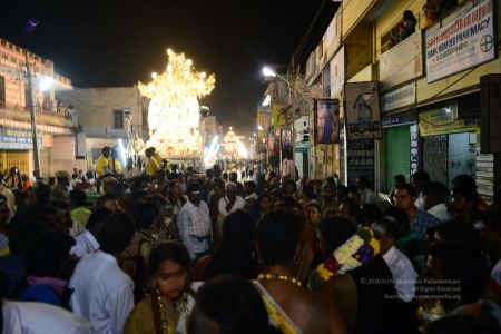 His Holiness blesses devotees on the streets of Tiruvannamalai in Panchamurthi Procession of the Annamalaiyar Temple in Thiruvannamalai