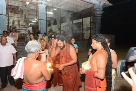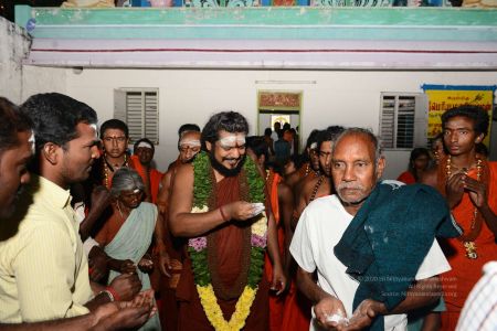 His Divine Holiness blessing devotees with vibhuti at the Mariamman Temple in Thiruvannamalai