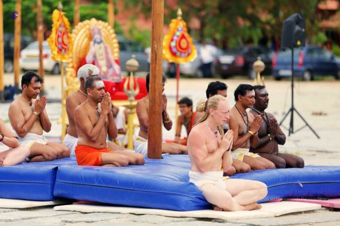 Delegates, sanyaasis and adheenavaasis watching the display of Shivastambha (mallakhamba) yoga asanas (postures)