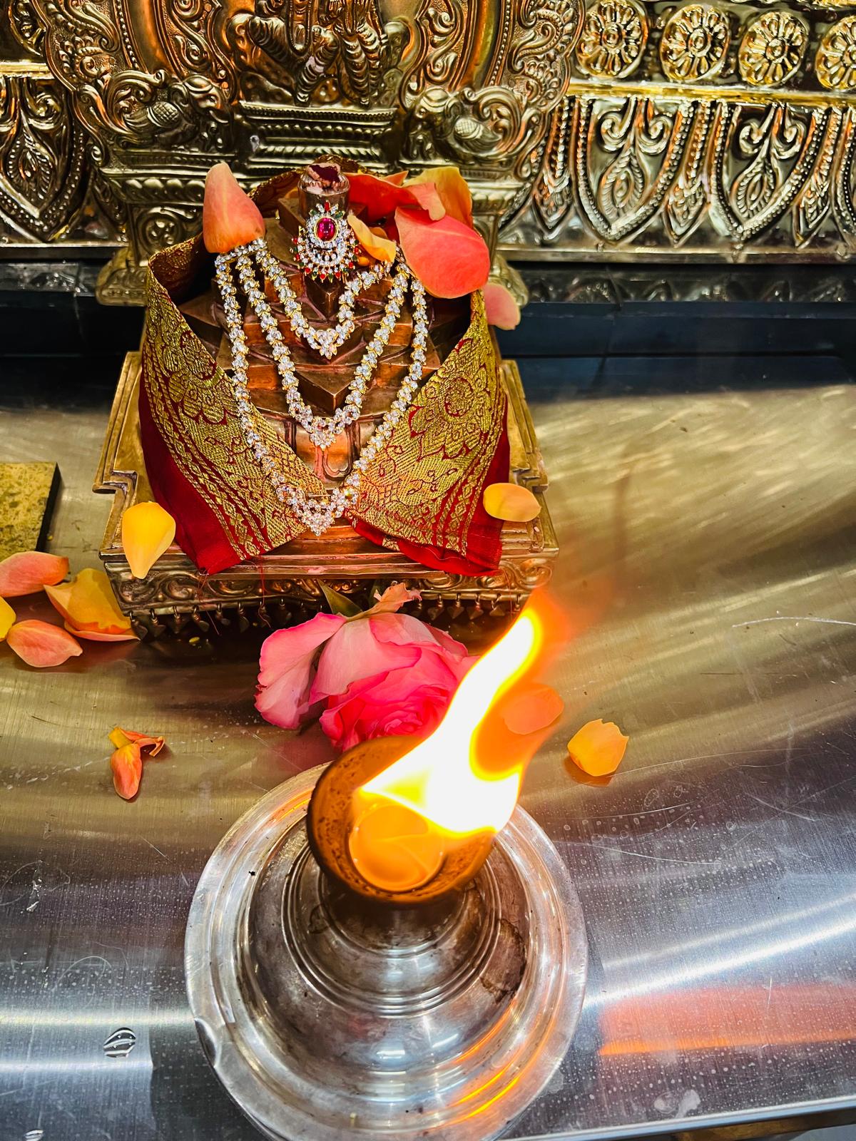 The formal temple worship began with the Suprapātam Seva, the sacred process of ritually waking the deities. This service is performed not only to honor the divine manifestations of Paramashiva and Devi but also to symbolize and invoke the awakening of the divinity inherent within every individual, seeking divine blessings at the start of a new day. This was followed by the Bhoga Murty Alankaram, where sacred clothing and jewels were meticulously offered to the deities of THE SPH, Devi, and Shiva Meru, reflecting deep devotion (bhakti) and respect for the divine presence.