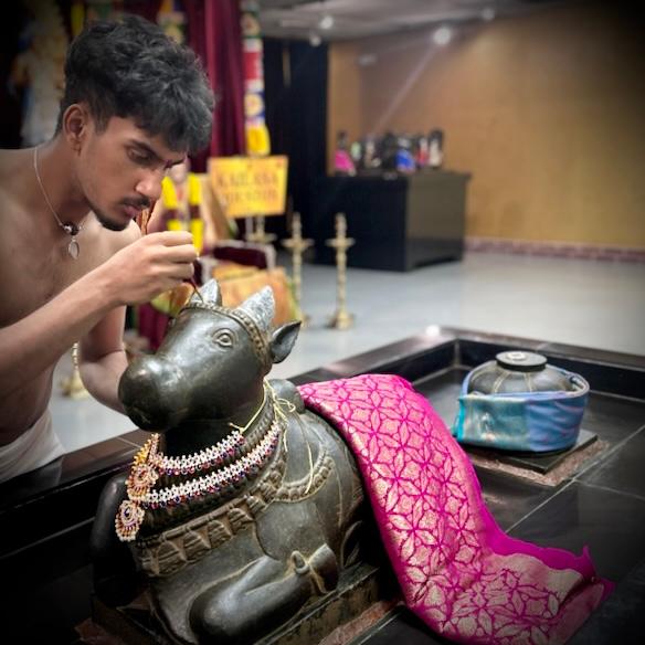 The ceremony was supported by the dedicated efforts of five volunteers who facilitated the various stages of the worship, ensuring that every aspect of the ritual was performed with Vedic precision and deep devotion. The Nandi Abhishekam involved the ritualistic bathing of the sacred bull, Nandi, who represents the ideal devotee and the eternal witness to the dance of Paramashiva. This was followed by the Shiva Puja, a sophisticated ritual of worship that invokes the divine presence, allowing those present to immerse themselves in the auspicious energy of the Monthly Shivarathri.