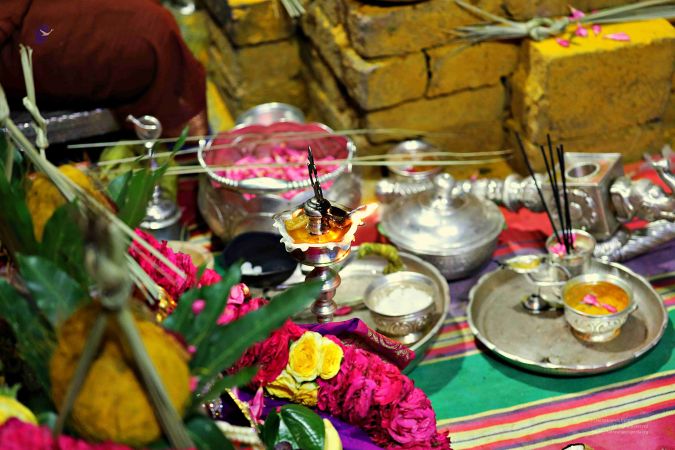 Offering of Deepa to kalasa's during Shiva Puja homa by Puja Acharya