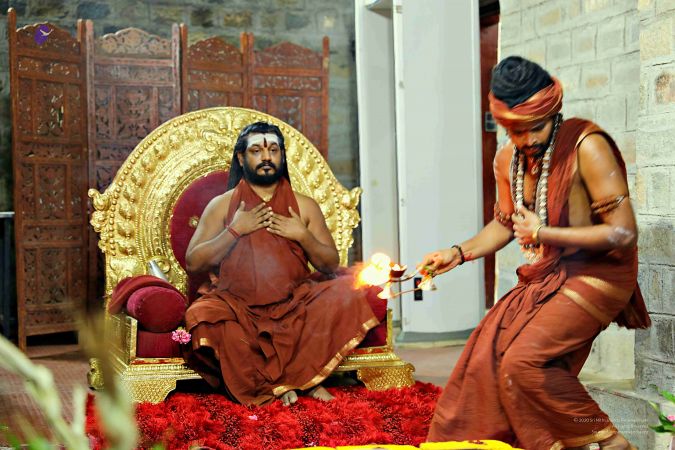 Temple Acharya offering Arathi to HDH Nithyananda Paramashivam
